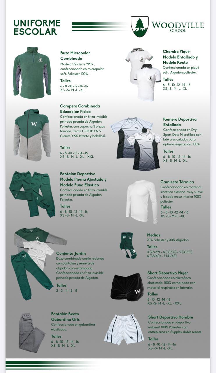 • Pantalón o bermuda gris liso, kilt verde inglés; chomba del Colegio, polar del colegio; medias verde inglés o blancas; zapatos escolares, botitas de trekking o zapatillas urbanas clásicas (no deportivas) de color marrón o negro y campera verde o negra.